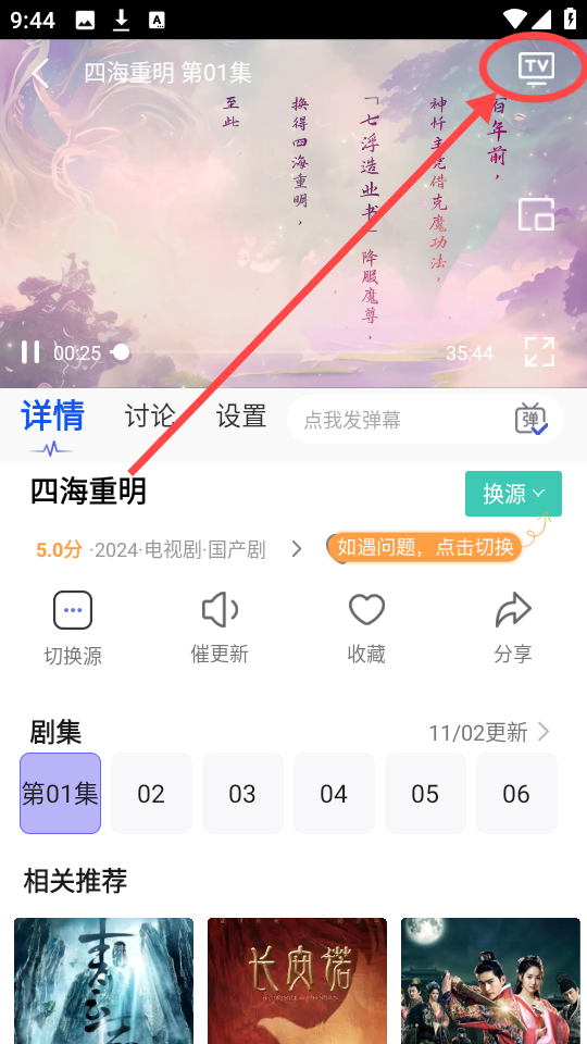 2、在播放界面的右上角找到“tv”标志,如图所示。