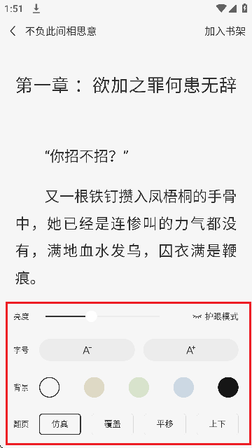 5、然后用户可以对软件进行个性化阅读功能设置,如图所示,这里可以调节亮点,字号,背景色,翻页效果等。