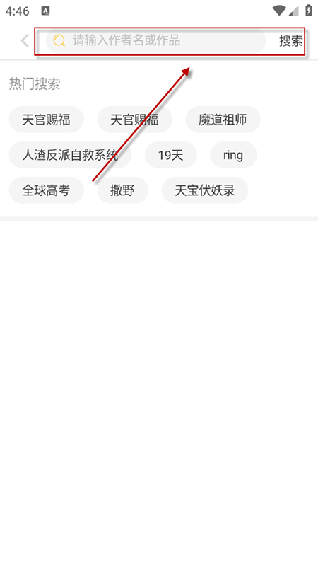 3、在搜索栏输入作者名或作品名→点击结果进入详情页,点击阅读。