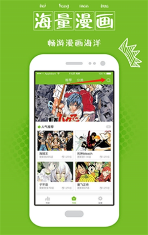 2、在首页会有很多的漫画可以选择,想要精准查找就点击右上角的搜索按钮,输入名字等待结果