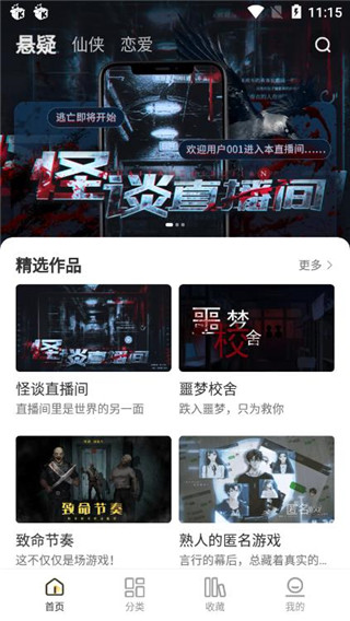 1、下载安装千梨互动,打开软件主页,在首页上可以看到有悬疑、仙侠、恋爱等题材小说