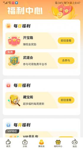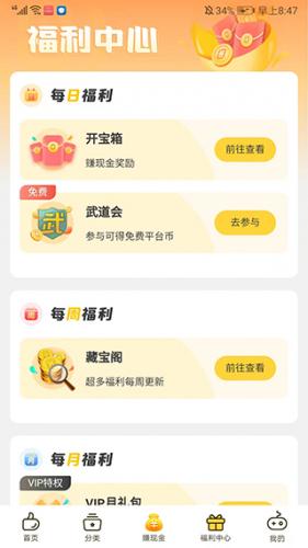 5、进入【福利中心】界面,包括每日福利、每周福利、每月福利等等不同类型的福利活动可以选择参与,