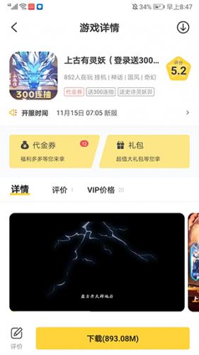 4、进入游戏详情界面,滑动屏幕我们可以了解游戏的介绍、评价、开服时间等信息,也可以领取代金券、礼包等福利,最后只需点击下载安装就可以体验了。