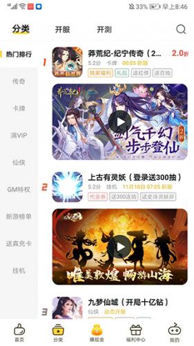 3、进入【分类】界面,包括传奇、卡牌、满VIP、仙侠、GM特权、开服、开测等丰富的游戏分类,玩家可以自行选择搜索感兴趣的游戏,我们以【上古有灵妖】为例。