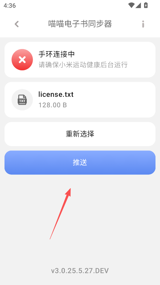 极简两步操作:打开应用后,只需先连接手环,再选择TXT文本文件,即可完成整本书的推送与同步,没有复杂的设置与冗余按钮,老用户和新手都能轻松搞定。