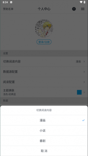 8、除了漫画之外,该软件还能够为用户提供相应的番剧、小说,可以通过我的界面下的切换阅读内容进行修改。