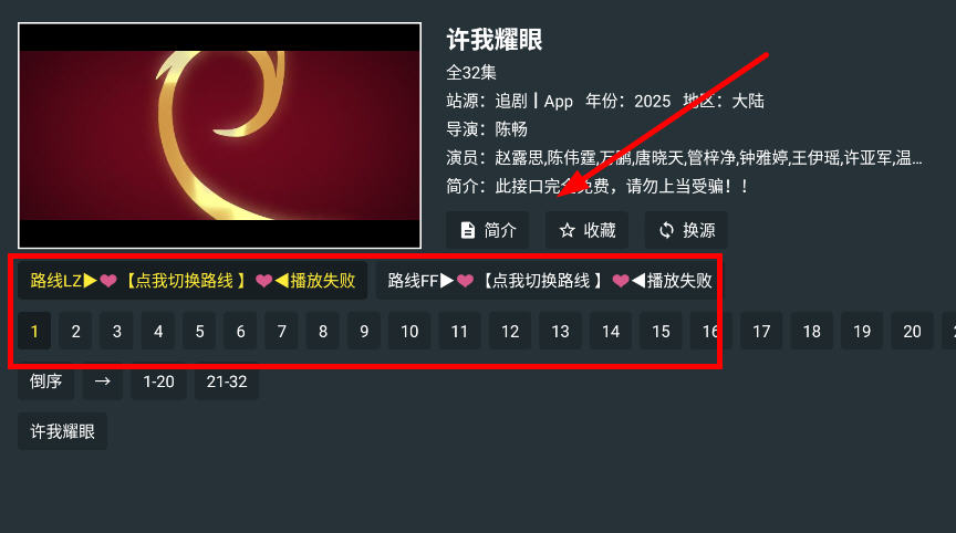 6、点开直接跳转播放,可以调整播放源和观看集数。