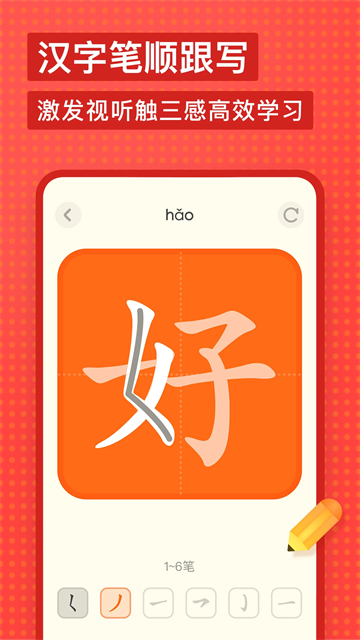 3. 汉字笔顺:所有汉字均配有动态笔顺演示与跟写练习,辅以真人标准发音,通过视觉、听觉与书写多感官联动,强化汉字书写规范。