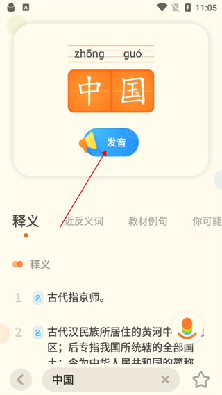 4、点击“发音”按钮,可收听由专业播音员录制的标准普通话读音;