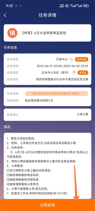 4. 在任务详情页点击“立即抢单”,成功接单后按要求完成任务。