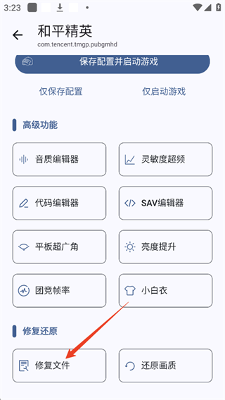 1、若游戏无法正常启动,请返回配置界面,滑动至底部并点击【文件修复】功能。